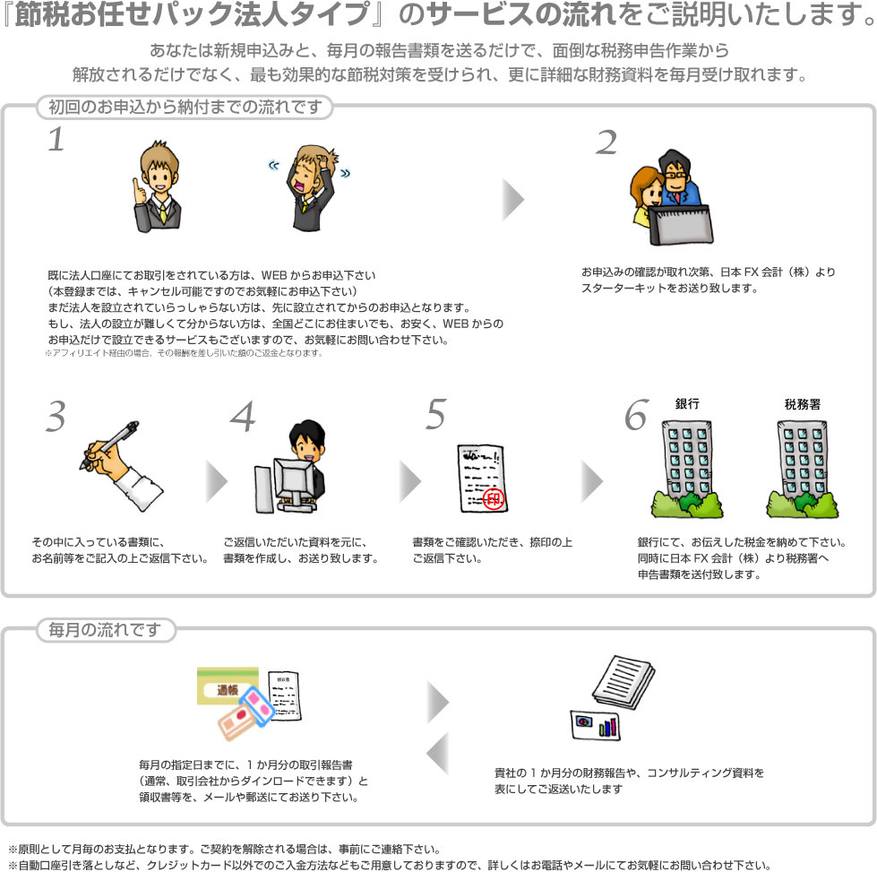 あなたはメールや郵送で、必要な書類を送るだけで、毎月具体的な資料を元に、法人経営や節税のコンサルティングを受けながら、万が一、FXで損をした時には被害を最小限に、利益が上がった時には最大限にそれを確保できるよう、適切に処理をさせて頂きます。