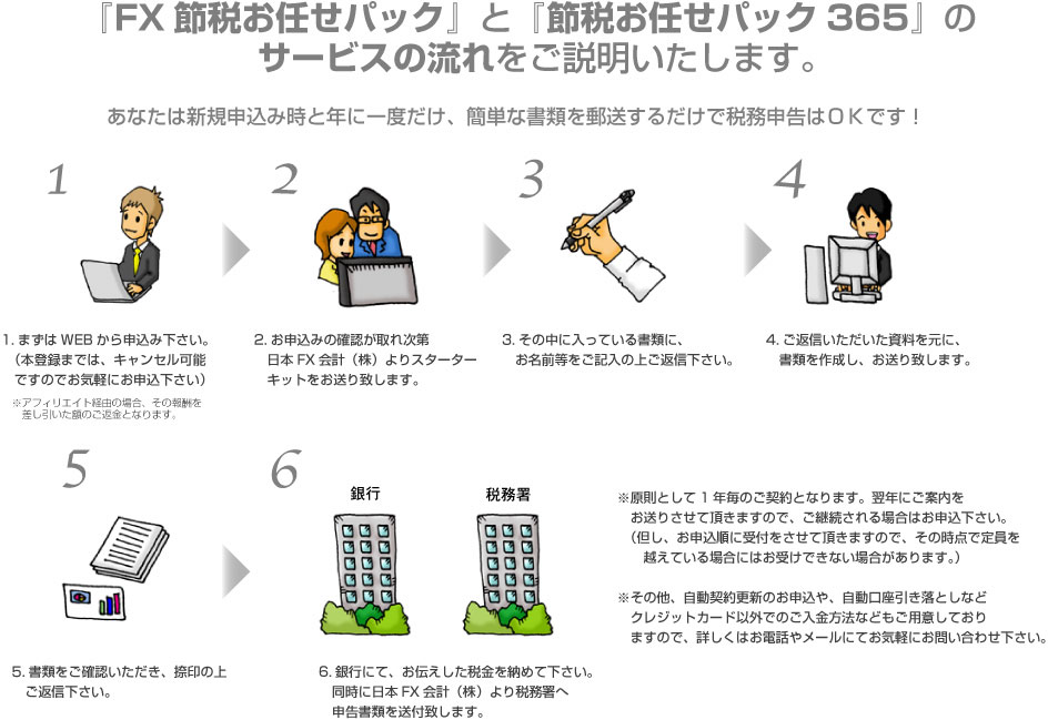 あなたは年に一度、必要な書類(FXの帳票や領収書など)をお送りいただくだけで結構です。確定申告の書類作成や申告作業など、難しくて面倒な作業は一切必要ありません。